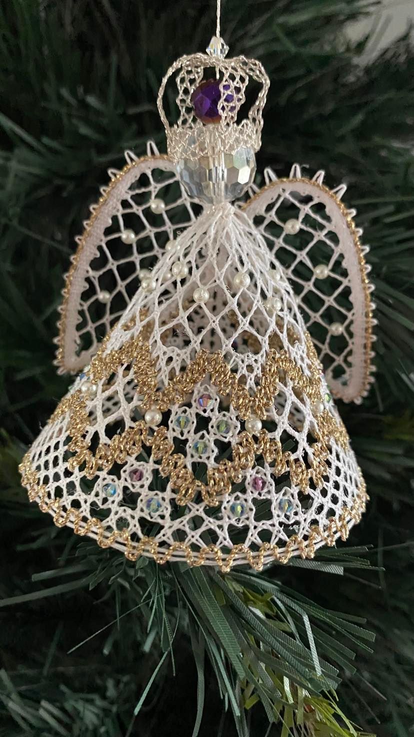 To emulate the gorgeous embroidered trellis work on the Queen's dress, plaits and four pair crossings have been used. Beads were considered at the crossing, however these would have pulled the plaits out of shape, so the beads were placed between the gold Cordonnets.